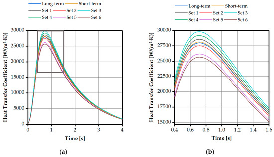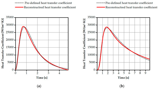 Figure 4a,b visualize the calculation results for the course of the reconstructed HTC and the predefined HTC for both cases. As shown in the figures, the reconstructed HTC was found to be in good agreement with the given curve for both cases, in terms of peak value, absolute values, and time offset. The peak-to-peak evaluation shows that this deviation is 0.05 s.