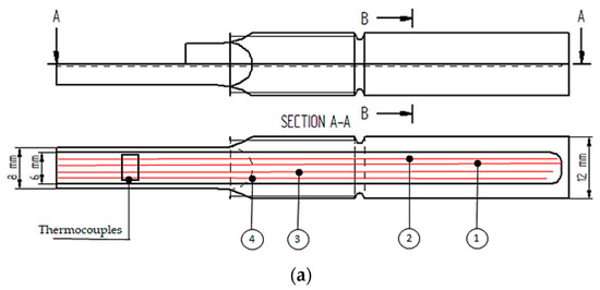 The presence of more than one temperature measurement point in the tool depth allows a better reconstruction of the heat transfer coefficient. Therefore, it was necessary to design and manufacture a temperature sensor that allows the temperature inside the tool to be measured at different distances from the die surface. The sensor should also assure long-term resistance to the process conditions, especially the temperature of the melt as well as mechanical loads. Furthermore, it should be compatible with the data acquisition hardware used for the project and should be usable by other systems for further applications. This goal was realized on the basis of simple electronics and joining technology and with a low complexity of the production steps. The design concept consists of two bodies joined by electron beam welding. Inside the sensor, a total of four type K thermocouples were integrated at close distances to the surface. The necessary pocket for the thermocouples was designed to be as small as possible in order to minimize distortion of the temperature field due to the recesses. The bodies were then further processed by machining to form a cylindrical body with additional geometric and functional features. The sensor was made of the same material (H11 tool steel) as the die and was hardened and tempered to 40 ± 1 HRC according to the usual procedure (annealing, quenching, and then two tempering stages). By using the same tool material, errors during reconstruction due to different thermal conductivities of the materials used were avoided. At the same time, there is good knowledge of the temperature-dependent thermal conductivity [20] of the hot work tool steel H11. By heat-treating to a hardness of 40 HRC, on the one hand the mechanical stability of the sensor was ensured. On the other hand, this hardness also ensured a reliable machining process and the compliance with shape and position tolerances, since hardness steps in the transition to the weld seam were avoided. Thermocouples from OMEGA Engineering (Deckenpfronn, Germany) were used and brought into direct contact with the substrate by local welding to ensure a fast response time with regard to the rapid changes in heat transfer at the interface between the component and the tool. The thermocouples used are 5TC-TT-KI-30 with a weld joint, and accuracy of DIN class 1. Each thermocouple has a diameter of 0.25 mm (with 30 AWG) and is protected against high temperatures by Kapton tape insulation [21]. The dimensions of the sensors are presented in Figure 5, with a schematic representation of the thermocouples inside. The numbers from 1 to 4 refer to the positions of the thermocouples according to their distance from the surface of the sensor. In addition, Figure 5b shows a cross-section of the sensor to illustrate the dimensions of the pocket in which the four thermocouples are integrated. Figure 6 shows the fully fabricated sensor. The arrangement of the thermocouples offers the advantage that several thermocouples can be integrated on one level, with each of them being positioned very close to the surface, adapted to the prevailing temperature gradient of the technical application. A possible disadvantage is the fact that the individual thermocouples are thus not arranged on a line perpendicular to the temperature gradient. This can be improved in other designs where the use of thin-film thermocouples is planned.