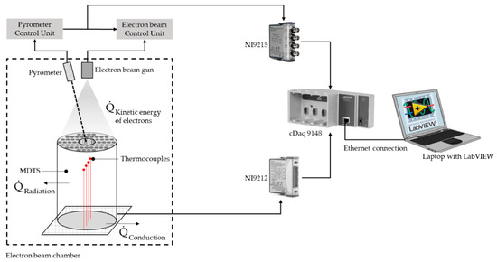 An important step before implementing the multi-depth temperature sensor in practice is to verify two relevant features that are of great importance for a meaningful reconstruction of the HTC. These two features are the accuracy of the sensor’s measurements and the efficiency in terms of time response. A sufficiently high accuracy of the HTC reconstruction requires that temperature measuring points are available at defined positions close to the surface and that the real existing positions also correspond to the positions assumed for the reconstruction. In fact, the exact position of the measuring point is usually only measured optically, whereby the exact position of the measured value generation for the weld spot on the thermocouple can often not be determined. The deviations in the range < 0.2 mm can lead to considerable errors in the reconstruction of the HTC, especially in the very near-surface area of the sensor (<2 mm), as calculations have indicated. For the investigations, the upper side of the sensor was exposed to a defined amount of heat generated by the electron beam gun inside the electron beam chamber. The temperature inside the sensor was measured on different levels by the thermocouples and at the same time the temperature of the surface was measured by a two-color pyrometer (M332) from Sensortherm GmbH integrated in the electron beam chamber. The measurement data were acquired using a script written in the LabVIEW development environment to ensure synchronization of both signals. The schematic test setup is shown in Figure 7.