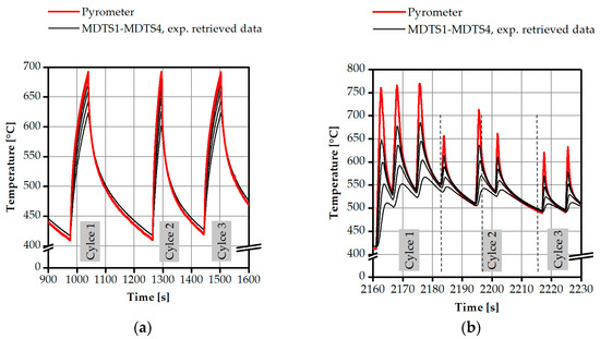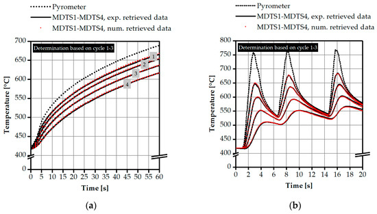 Figure 8 shows an example of the synchronized temperature curves of a multi-depth temperature sensor and a pyrometer for comparatively slow heating rates. High temperatures were deliberately chosen to verify the usability of the sensor at high temperatures. For casting processes, however, more dynamic heating rates are relevant. Thus, in further experiments, a higher energy of the electron beam was used to achieve higher heating rates (see Figure 8b). An evaluation of the time offset of the respective maxima (pyrometer and MDTS-1) resulted in a difference of approximately 0.13 s to the first near-surface temperature sensor, which is considered, as an initial time response guess, a very good value considering the measurement signal of the ratio pyrometer, which can be assumed to be without delay. Thus, it could be shown that measurements up to 750 °C at the surface of the pyrometer are possible. The sensor allows a fast reaction to abrupt changes in surface temperature. As mentioned above, a necessary step for a meaningful reconstruction of the heat transfer coefficient is the determination and validation of the exact positions of the thermocouples inside the sensor. The calibration and evaluation of the sensor was performed for two different heat flux densities and associated heating rates. On the one hand, relatively long heating and cooling cycles (Figure 8a) as well as for short-term temperature variations (Figure 8b), as they occur with similar dynamics in casting processes. For the purpose of determination and validation, the simulation environment ANSYS was used, in which the finite element method was applied for a thermal model to calculate the transient temperature fields inside the sensor body. The same boundary conditions as in the experimental step were implemented and the temperature measured by the pyrometer was now defined as a transient temperature boundary condition at the surface. The model was solved and the calculated temperature curves at discrete points were compared with the real measured temperature curves. The Newton–Raphson method was used to vary the position of the virtual thermocouple until a minimum of deviation between the calculated and experimentally determined result was found. The procedure was applied for long and short-term measurements and for all four measuring positions. In each case, three different cycles were chosen for the determination of the exact depths, and the average of the retrieved positions has been considered. For the long-term evaluation, only the heating cycles were used in order to avoid any secondary effects regarding the difference in boundary conditions between the simulation and the real experimental environment. The evaluation of the results made it possible to identify the corresponding positions {−1.5; −2.45; −3.8; −5.4 mm} in the case of long-term evaluation (Figure 9a), and {−1.5; −2.5; −3.95; −5.8 mm} for the short-term evaluation (Figure 9b) for the four thermocouples (MDTS1 to MDTS4). The procedure also allowed the depth determined in each case to be indicated with a mean value and a standard deviation; details can be found in Table A1.
