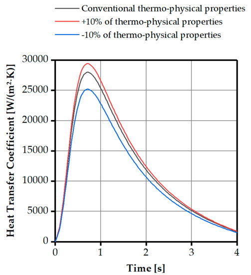 The temperature-dependent thermophysical properties also have a considerable influence on the HTC reconstruction. Hence, the uncertainty of the HTC regarding the variation of the thermal conductivity and the specific heat was evaluated. The conventional values of the thermophysical properties of the steel H11 (see Table A2) were varied by ±10%. The results of the calculation in Figure 11 show that the error of the signal does not exceed 5.1% when the values are increased by 10%. A decrease of 10% leads to a maximum error of 10% of the reconstructed HTC.
