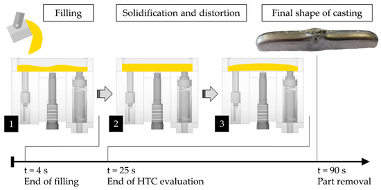During the filling phase (step 1), which was measured due to the manual filling of 4 s, the molten melt was poured directly onto the sapphire windows (pyrometer). This results from the high peak, which was recorded at casting temperatures of approximately 700 °C for all casting series carried out (Figure 15). At the same time, however, the multi-depth temperature sensor did not detect the maximum die temperature, so that the die starts to heat up to record a first peak value for the first two seconds and then rises to a maximum peak value of about 225 °C. The main reason is the flow of the liquid metal from the center of the cavity to the end of the cavity wall and back to the inner sides, immediately after the filling phase and during the first seconds of the solidification phase (step 2). During the solidification phase of about 90 s, the melt began to solidify and lift off from the ends of the mold cavity. The evaluation of the HTC during the solidification phase took place in a time interval of 25 s. At the end of this phase, the completely solidified casting has a shape as shown in step 3 of the process; the uncovered shape may be the cause. Figure 15 represents the measurements of temperatures profiles for the die and cast for the first casting cycle.