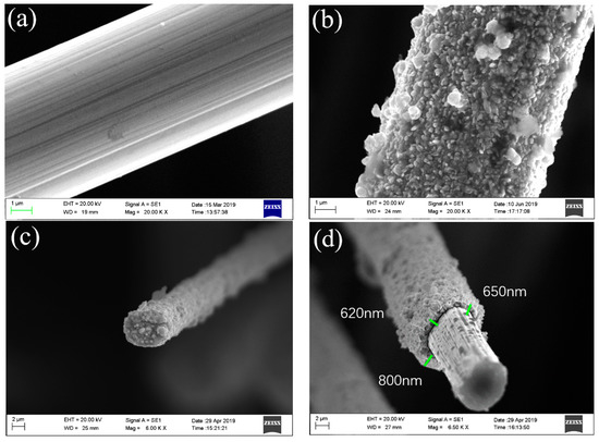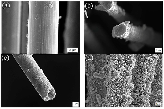 The micro morphology of Cu-coated braided carbon fiber rope: (a) as-received carbon fiber; (b) surface coating of carbon fiber; (c) ends of copper plated carbon fiber; (d) cross section of copper plated carbon fiber.