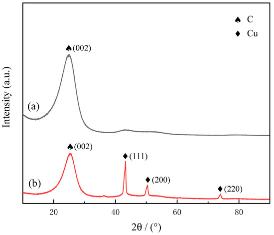 XRD spectra: (a) uncoated braided carbon fiber rope; (b) Cu-coated braided carbon fiber rope.