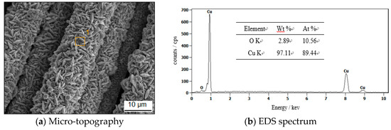 The XRD spectra of the Cu-coated braided carbon fiber rope was shown in Figure 3b. There were three strong diffraction peaks at 2θ at 43.29°, 50.43°, and 74.13° correspond to the (111), (200), and (220) crystal plane of Cu, respectively. The crystal face was found to have a characteristic peak corresponding to the (002) crystal plane of graphite at 2θ = 25°, and the corresponding peak of the coated carbon fiber was weaker than that of the uncoated carbon fiber as shown in Figure 3a. It clearly indicated that Cu was successfully coated on the surface of braided carbon fiber rope by XRD analysis [32]. Figure 4 was an energy spectrum analysis of copper-plated carbon fiber. According to the EDS results, the surface of the carbon fiber after dip-coating mainly contains Cu element, and its mass fraction was 97.11%. Furthermore, there was a small amount of O element with a mass fraction of 2.89%. This indicates that there was no obvious oxidative damage on the surface of the carbon fiber. Cu in the coating mainly exists as a simple substance, and only a very small amount of Cu was oxidized, which will be verified again in the subsequent XPS results.