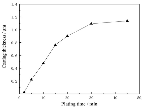 The plating time is a major factor in controlling the thickness and quality of the coating. Figure 6 shows the relationship between plating time and plating thickness. It can be seen from the figure that the thickness of the plating layer increases with the increase of the plating time but the increase amplitude gradually decreases. Since the thickness of the coating required for this experiment is 0.5 to 1 μm, the time is controlled at about 15 min. The change in coating thickness is related to the surface-coated catalyst particles. At the beginning of copper plating, the catalyst Pd can provide sufficient nucleation sites, so that Cu2+ in the plating solution can quickly deposit nucleation on the catalyst Pd after reduction by the catalyst, the reaction deposition rate is higher, and the thickness of the coating increases faster. With the continuous deposition of Cu2+ in the nucleation site in the plating solution, after the carbon fiber surface is completely covered with copper particles, the reduced Cu can only be deposited on the original copper particles, and its catalytic reduction activity decreases. The concentration of Cu2+ was greatly reduced, resulting in a slow increase in the thickness of the coating after 30 min.