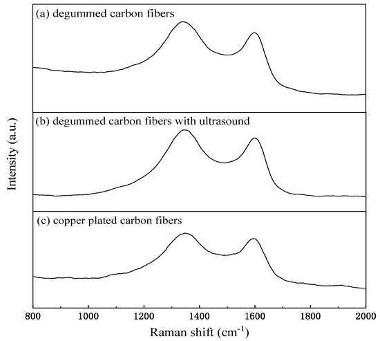 Raman analysis has been known to be a useful method to characterize the surface structure of carbon fibers. Raman spectrum of carbon fibers usually show two main peaks, which identified as the D band (about 1358 cm−1) and G band (about 1582 cm−1) [34]. In general, the D band is connected with asymmetric carbon atoms and structural defects, which can be seen in the single crystal graphite [35]. The G band is taken for strong vibrations in the opposite direction of connected carbon atoms in the plane of the graphite mesh [36]. Raman spectrum of degummed carbon fibers, degummed carbon fibers with ultrasound, and Cu plated carbon fibers in the 800–2000 cm−1 region with an excitation wavelength of 532 nm are shown in Figure 7. With the process of Ultrasonic treatment, the structural disorder of carbon fibers was reduced. It is considered to be attributed to the oxidation of ultrasound [37]. After Ultrasonic treatment, the Raman spectrum of the carbon fibers showed a higher relative intensity ratio ID/IG, indicating an increase in both degree of disorder and the amount of the functional groups. The intensity of the D peak also decreases with the oxidation time, while the position remains unchanged, and the FWHF of the D and G bands gradually narrows, indicating that the chemical heterogeneity is reduced and the structural order is increased.
