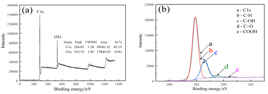 XPS spectra analysis of the braided carbon fiber rope after degumming treatment is shown in Figure 8a. It was found that the carbon fiber surface contained C and O elements at the binding energy of 284.82 eV and 532.93 eV, respectively. The oxygen content is about 14.81%, which is mainly due to oxidation during the degumming process. The pretreatment process not only increases the specific surface area of the carbon fiber surface but also increases its surface activity. The C1s peak was subjected to peak fitting processing (Figure 8b). It was found that the surface of the braided carbon fiber rope after degumming had many oxygen-containing functional groups. The relative content of various functional groups was measured by Advantage treatment by reference to the XPS manual, as shown in Table 3, the C-OH content is about 24.83%, the C=O content is about 1.71%, the COOH content is about 2.59%, and the oxygen-containing functional groups on the surface are obviously increased, which also makes the braided carbon fiber rope more hydrophilic and provides a good basis for subsequent copper plating tests.