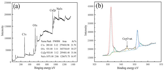 In order to determine the chemical composition in the coating, XPS spectrum analysis was performed on the surface of the copper-plated braided carbon fiber rope, and a peak-fitting analysis was performed on the Cu2p peak. As shown in Figure 9a, a survey spectrum analysis of copper-plated carbon fibers found that there were other small impurity elements in addition to the Cu, C and O elements in the coating. These impurity elements were derived from the plating solution, such as a peak near 1071 eV, which was determined to be a Na element. This is due to the fact that NaOH remains on the surface of the carbon fiber when the pH is adjusted during the configuration of the plating solution. It can be seen from the spectrum that there were obvious carry-up peaks near the main peak of Cu2p (after photoionization, the transition of valence electrons from occupied orbits to higher unoccupied orbits due to the excitation of the inner electrons; this transition process is called carry-on process, and the energy loss peak that appears at the high binding energy end of the XPS main peak is the carry-on peak), indicating that these elements have undergone energy level splitting during the binding process, in other words, the valence state of these elements has changed [38]. The peak fitting analysis of the Cu2p peak is shown in Figure 9b. The main peak does not show a strong satellite structure. The fitted peak appears at 934 eV, which corresponds to CuO. This is mainly due to the contact between the copper-plated carbon fiber and the air, resulting in oxidation of the surface of the copper-plated layer.
