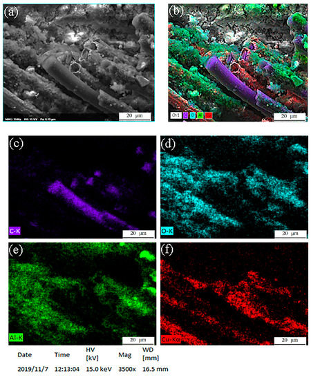 The micro-morphology of copper-plated carbon fiber and aluminum-based composite materials is shown in Figure 10a. The EDS element surface scanning analysis of the C, Al, Cu, and O elements in this field of view was performed, and the result integration is shown in Figure 10b.The copper plating on the surface of a few carbon fibers is peeled off, and, due to the loss of the fixation and protection of the coating, the integrity of the carbon fiber and the original distribution of the carbon fiber are damaged, resulting in an increase of defects, such as breakage, damage, and misalignment of the fibers in the composite material. C-elements came from carbon fibers and were mainly distributed in the shape of lines where the carbon fibers appear. Cu elements were distributed around the bonding interface between the carbon fibers and the matrix in dots or lines. Al the elements were the absolute majority distributed in areas other than carbon fibers.