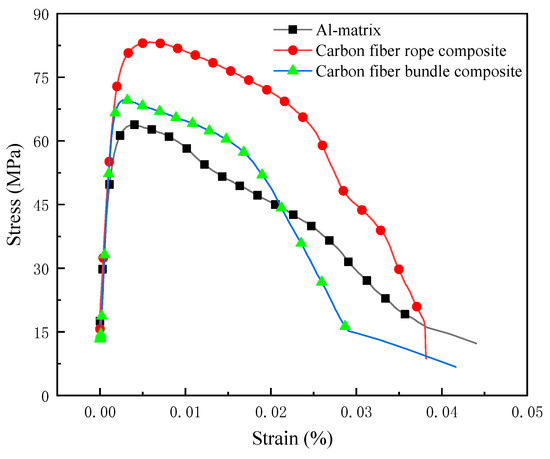 According to Equations (1) and (2), when the volume fraction of the reinforcing phase carbon fiber in the composite material is 4%, the theoretical tensile strength of the composite material with the carbon fiber bundle and the braided carbon fiber rope as the reinforcing phase was 254 MPa and 227 MPa, and the measured tensile strength reached 27% and 36% of its theoretical tensile strength, respectively.