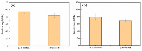 Figure 12 shows the comparisons of the tensile properties: Cu-coated and uncoated braided carbon fibers, as well as Cu-coated and uncoated carbon fiber bundle. The number of samples is 5, and the measurement results are averaged.