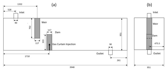 Figure 1. Dimensions of single-strand tundish (unit: mm): (a) Frontal View; (b) Lateral View.