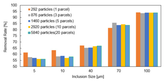 Figure 3. Comparison of inclusion removal rate obtained by different injected particle number (inclusion density: 3500 kg m−3; Case 2-W + HD).