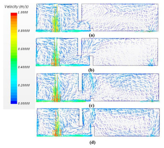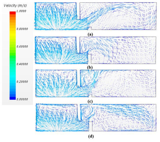 Figure 5. Velocity vectors at center longitudinal plane: (a) Case 1-W + LD, (b) Case 2-W + HD, (c) Case 3-W + LD + G, (d) Case 4-W + HD + G.