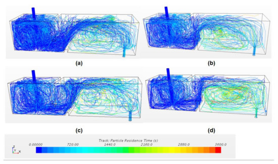 Figure 7. Trajectories of inclusion particles (inclusion density: 3500 kg m−3; inclusion size: 10 μm): (a) Case 1-W + LD, (b) Case 2-W + HD, (c) Case 3-W + LD + G, (d) Case 4-W + HD + G.