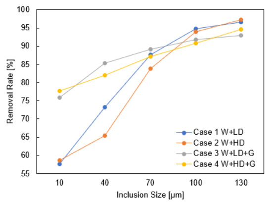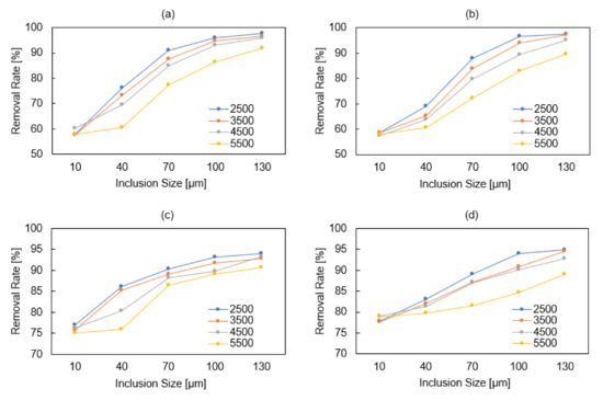 Figure 9. Comparison of inclusion removal rate with change of inclusion density: (a) Case 1-W + LD, (b) Case 2-W + HD, (c) Case 3-W + LD + G, (d) Case 4-W + HD + G.