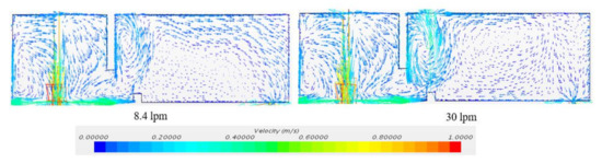 The discretized equations are solved in a segregated manner with the semi-implicit method for the pressure-linked equations (SIMPLE) algorithm. The second-order upwind scheme is used to calculate the convective flux in the momentum equations. The solution is judged to be converged when the residuals of all flow variables are less than 1 × 10−4, together with the stability of the velocity and the turbulence at the key monitor points. The flow fields are calculated in steady state. The transient calculation is used to solve the discrete phase equations. The under-relaxation parameters of flow calculations for the pressure, the velocity and the turbulence are 0.3, 0.7 and 0.8, respectively.