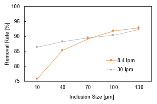 Figure 8. Comparison of the inclusion removal rate with the change of particle size (inclusion density: 3500 kg m−3).