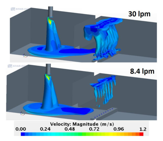Figure 12. Isosurface of turbulence kinetic at different gas flow rates. (Case 3-W + LD + G, k = 0.0035 J kg−1, Q = 8.4, 30 lpm).