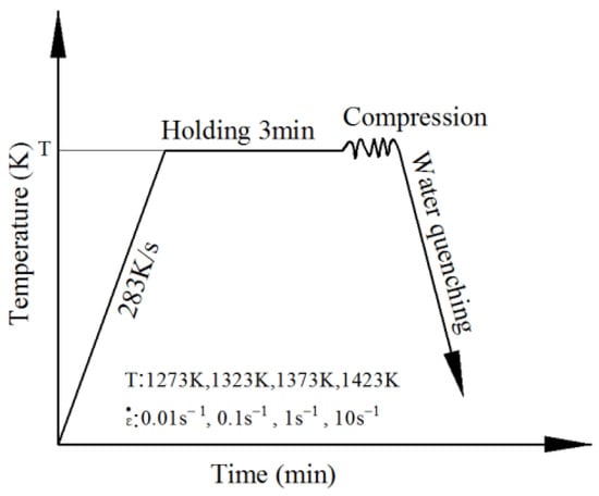 Thermal simulation experiments can be used to determine the heating temperature range of the billet when the high-speed train axle is rolled by three-roll skew rolling. According to the process characteristics of three-roll skew rolling and the material properties of 30CrMoA steel, the experimental stress–strain curve measurement process is shown in Figure 1. First, the small cylindrical sample is heated to the experimental temperature T at a heating rate of 283 K/s. Second, the sample is held for 3 min in order to be uniformly heated. Then, the sample is compressed by 60% in the axial direction at a certain strain rate and the experimental data is recorded by a computer. Lastly, the sample is water quenched immediately after the compression is completed.