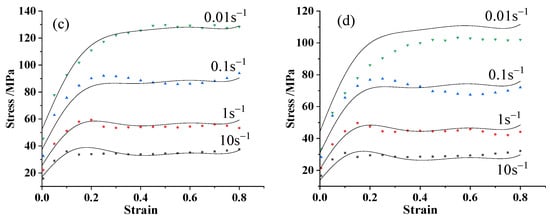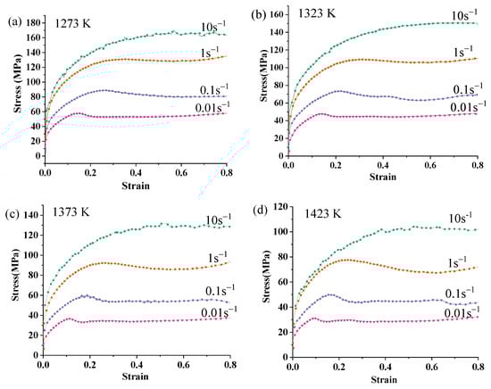 Experimental stress–strain curve of 30CrMoA steel under high-temperature compression: (a) T = 1273 K, (b) T = 1323 K, (c) T = 1373 K, and (d) T = 1423 K.