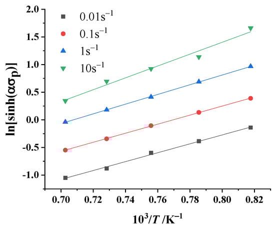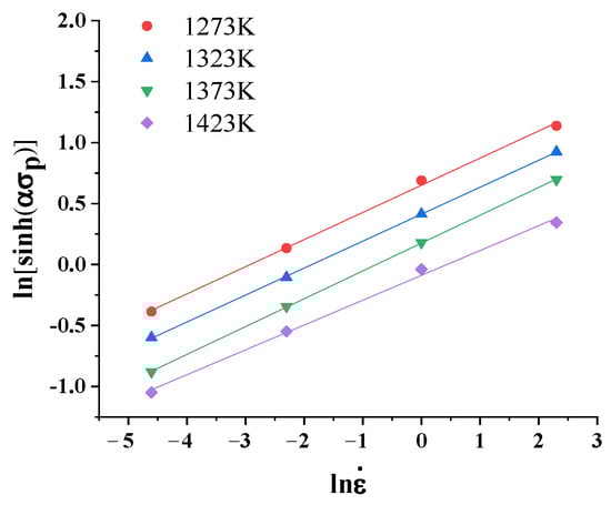 By substituting α = 0.011 MPa−1 into Equation (6), the relationship between and ln[sinh(ασp)] can be obtained, as shown in Figure 4. From Equation (6), the inverse of the slope of the straight line is n and the mean of n is 4.403.