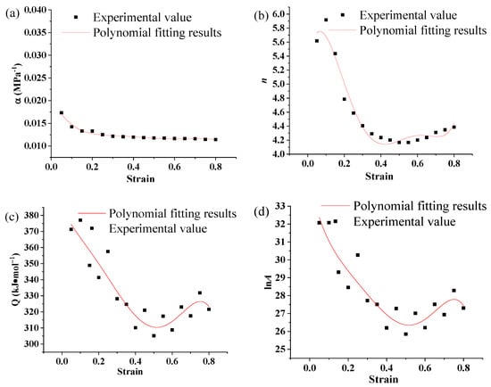 When the constitutive model based on the Arrhenius equation is applied, the influence of the strain at high temperature on the flow stress of the material is usually ignored. Only the steady-state stress or the peak stress is analyzed when the model is established [,]. In fact, the material constant changes with strain. The material constant can be described as a polynomial function of strain. In addition, the fitting accuracy is the highest when the polynomial degree is 5 [,]. In the empirical constitutive model, considering the effect of strain on the material constant is called strain correction.