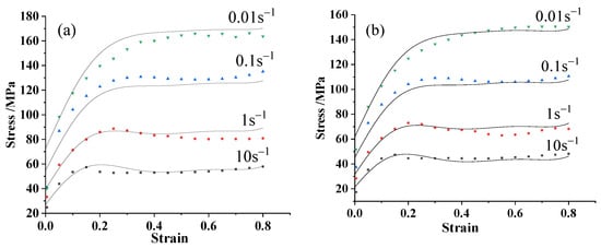 In order to verify the constitutive model of 30CrMoA steel with strain correction, the fifth-degree polynomial coefficients in Table 2 are substituted into Equation (14). The theoretical values are compared with experimental values of flow stress with a strain variable of 0.1–0.8 at an interval of 0.05. The comparison result is shown in Figure 7. The solid lines in the figure are the theoretical value, and the points are the experimental value. It can be seen from Figure 7 that the theoretical value is very close to the experimental value of the flow stress.