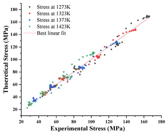 Comparison of theoretical and experimental values of the constitutive equation with strain correction: (a) 1273 K, (b) 1323 K, (c) 1373 K, and (d) 1423 K.