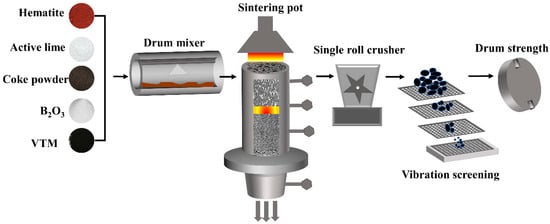 - Liu, H.; Zhang, K.; Ling, Q.F.; Qin, Y.L. Effect of B2O3 Content on the Sintering Basic Characteristics of Mixed Ore Powder of Vanadium–Titanium Magnetite and Hematite. J. Chem. 2020, 2020, 6279176. [Google Scholar] [CrossRef]