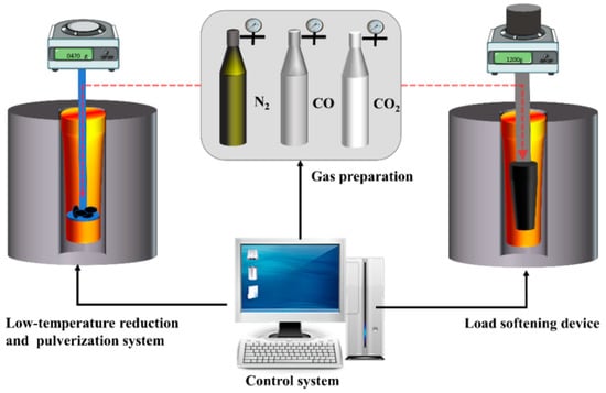 After undertaking the sintering pot test, the samples were broken, and screened samples were taken according to a certain proportion of particle size distribution to form a comprehensive sample, which were then subjected to low-temperature reduction, pulverization, reduction and soft melt dropping (Figure 2) to study the effect of B2O3 on the metallurgical properties of the sinter. These tests are described in the following subsections.