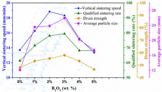 The results of the tests undertaken in this work revealed that B2O3 significantly affected the key properties of the sinter. Figure 3 shows that with the increase in B2O3, the drum strength of the sinter increased rapidly from the initial level of 48% (0% B2O3) to reach a maximum value of 58.0%, when the B2O3 ratio was 3.0%, but decreased with the further addition of B2O3 to 46.7% at 5.0% B2O3. The vertical sintering speed increased first, then decreased, also showing a maximum at 2.0% B2O3. Within the range of 0.0–3.0% B2O3 addition, the qualified rate of sintered samples generally improved, but with B2O3 > 3.0%, both parameters decreased.