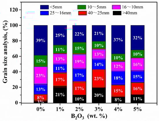 The overall average particle size first increased and then decreased, which is illustrated in Figure 4. Figure 5 illustrates that the particle size distribution of the sinter changed significantly with the addition of B2O3. The test with 1% addition of B2O3 reduced the share of particles <5.0 mm from 39% to 25%, and the share of >40 mm particles increased from 3% to 21%. This in practice means that the content of the bulk sinter increased strongly, and the overall particle size of the sinter also increased. A likely reason for the observed changes is the enhanced adhesive effect caused by the increase in the liquid phase content of the sintering sample along with the increasing levels of B2O3. To analyze this from a theoretical perspective, the equilibrium composition was estimated by FactSage software. The results demonstrated that the liquid phase region expands when B2O3 is added []. In most of the liquid phases, B2O3 reacted with some of the oxides in the raw material mix to generate components with low melting points, such as 2CaO·B2O3·SiO2, CaO·B2O3·2SiO2, CaO·2B2O3, CaO·B2O3, MgO·2B2O3, 2Al2O3·B2O3, CaO·B2O3·Al2O3 or 2CaO·B2O3·Al2O3. All these substances have melting points below 1200 °C, and hence can form liquid phases at the temperatures of the experiments [].