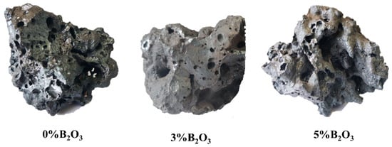 The melting point of B2O3 is 450 °C, and its boiling point is 1860 °C. Owing to the low melting point, the addition of B2O3 before sintering can promote the generation of liquid crystal nuclei. Furthermore, since the radius of the boron ion is small (0.02 nm), it can diffuse quickly into the crystal lattice of calcium orthosilicate, thereby stabilizing the crystal form of the orthosilicate, reducing the natural pulverization rate and improving the overall strength and particle size of the sample. Along with an increase in B2O3, the liquid phase increases. During the cooling phase, the liquid phases shrink and crystallize, and the over-melted sintered liquid phases may also froth because of the reduced surface expansion []. This finding applies to higher B2O3 contents: contents above 3% lead to large holes and thin-wall structures in the particles, as shown in Figure 6.