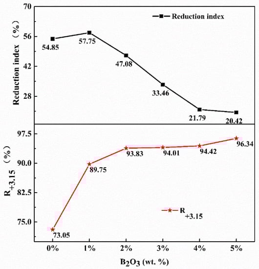 Before B2O3 was added, the low-temperature reduction pulverization index was 73.0%, but an increase of 1.0% in B2O3 resulted in an increase of 16.8 points to 89.8%, as shown in Figure 7. However, a further increase in the B2O3 content did not significantly improve the index. The addition of B2O3 decreased the low-temperature reduction of the smallest (−0.5 mm) fines significantly, from 11.5% to 2.6%, and thus it enhanced the ability of the sinter to resist low-temperature reduction pulverization and significantly reduced the amount of powder at low temperatures. The primary process of sintering was completed in less than 5 min, and the properties and quantity of the primary liquid phase during the sintering of vanadium and titanium were found to affect the formation of the structure of the mineral phase. The viscosity of the liquid phase is a critical factor affecting the reaction rates. The presence of B2O3 decreases the viscosity of the liquid phase. The liquid phase shrinks sharply during the cooling process, giving rise to pores. The effect may be indirect on pore volume and the intergranular distance of grains, as the permeability is increased and the coke burning reactions proceed more effectively. The permeability of the combustion zone was improved. This phenomenon was also beneficial to the diffusion of Ca2+ to the Fe2O3 surface in the liquid phase, allowing for the natural formation of calcium ferrite. The reduction ability and the strength of the calcium ferrite liquid phase were better than those of the silicate liquid phase and perovskite, and improved the overall resistance to pulverization of the vanadium–titanium sinter.