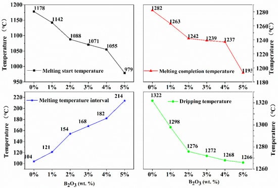 Figure 8 shows that after B2O3 addition, the melting start and end temperatures of the sinter sample decreased significantly, the melting temperature interval increased considerably, and the dripping temperature decreased. When no B2O3 was added, the melting temperature interval of the sinter sample was 104 °C, which increased by 110 °C with 5% B2O3 addition. Thus, the melting interval is strongly affected by the addition of B2O3 to the mixture. The reason for this is that as some free B2O3 exists in the sinter, its low melting point and excellent dissolution performance make it react with various metal oxides to form low melting-point compounds.
