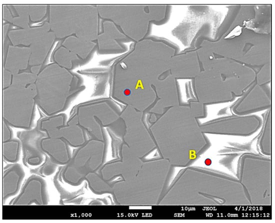 At points A and B in Figure 11, the main elements are as shown in Table 4. The Ti content at point A was high and thus was preliminarily judged to be primary titanium magnetite. B represents the grey filled area between the iron oxide phases, and is a common area of dicalcium silicate, calcium ferrite and perovskite with enriched boron. With the gradual increase in the B2O3 ratio, the hematite or ilmenite gradually changed from an initial lamellar- and plate-like shape to a granular- and worm-like shape. The structure also changed from non-uniformly distributed large blocks to a uniformly distributed interlaced structure. The distribution of ferrite and titanium iron compounds was very uniform, and the structure gradually changed from a large area of plate structure to a small area of granular and dot structure. Boron was enriched in a common area of dicalcium silicate and composite calcium ferrite. Therefore, B2O3 significantly improved the fluidity of the binder phase and increased the total number of cohesive phases.