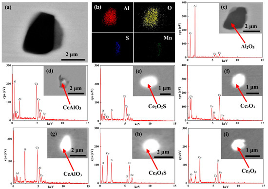 Figure 1. Morphologies and compositions of inclusions: (a,b) Al2O3-MnS and (c) Al2O3 in the 0# experimental sample; (d) CeAlO3, (e) Ce2O2S and (f) Ce2O3 in the 1# experimental sample; (g) CeAlO3, (h) Ce2O2S and (i) Ce2O3 in the 2# experimental sample.