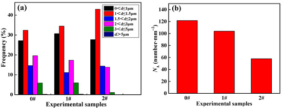 Figure 2. Size and number distributions of inclusions in the 0#–2# experimental samples: (a) diameter distribution of inclusions; (b) number of inclusions per unit area.