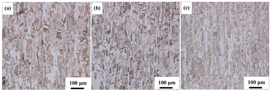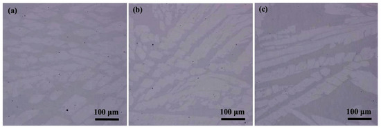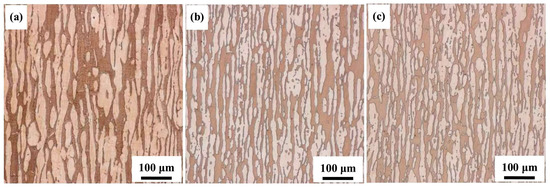 Figure 5. Metallographic microstructures of the 0#–2# experimental samples: (a) 0#; (b) 1#; (c) 2#.