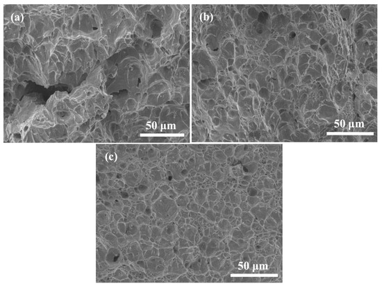 The impact energies of the 0#–2# experimental specimens are shown in Figure 8. It reveals that the impact energies of the three experimental specimens are gradually increased with the increase in Ce content. The impact energies of the 0# and 2# experimental specimens are 228 ± 7.3 J and 261 ± 10.7 J, respectively. In addition, the impact energy of the 2# experimental specimen is 14.5% larger compared with the 0# experimental specimen, which shows that the Ce element plays a positive role in improving the impact toughness of LDX2101 duplex stainless steel. Figure 9 shows the impact fracture morphologies of the 0#–2# experimental specimens. The fracture morphology of the 0# experimental specimen shown in Figure 9a is typical cleavage fracture with a low impact energy. Figure 9b,c show the fracture morphologies of the 1# and 2# experimental specimens, which reveal that the fracture morphologies of the 1# and 2# experimental specimens show a mixed fracture of cleavage fracture and dimple fracture. Simultaneously, the dimples on the fracture surface of the 2# experimental specimen are in larger number and more uniform compared with the 1# experimental specimen, which shows that the dimple fracture degree of the 2# experimental specimen is higher than the 1# experimental specimen. The above analysis results are consistent with the impact test results.