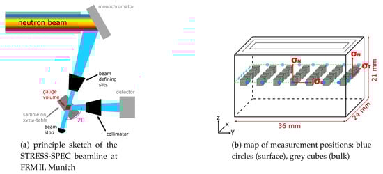 Stress determination by neutron diffraction (ND) was carried out at the STRESS-SPEC diffraction instrument [] at the neutron facility FRM II in Munich, Germany (Figure 2a).