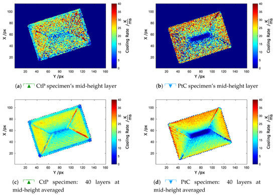 Cooling rates measured by the different between images taken at and after an apparent temperature of 700 was observed for the last time. Thermography data for both samples was obtained during the build process at the middle of the total build height. (a,b) display the mid-height layer, (c,d) display an average of 40 layers around the middle of the total build height.
