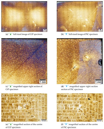 The largest defects were situated close to the edge of the sample (Figure 6b,c). A total porosity of 0.28% was observed.