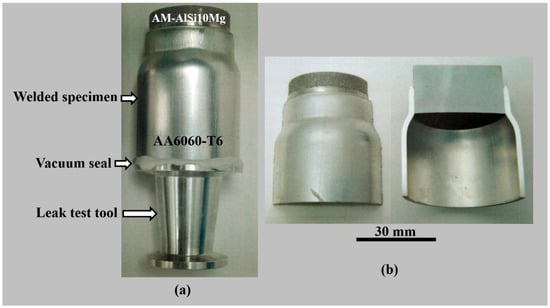- The as-welded samples were cemented to a commercial vacuum connector shown in Figure 3a. The He leak tests were performed by the “spray-probe” technique to estimate the weld quality. An EDWARDS ELD500 Helium leak detector was coupled directly to the vacuum system, to evacuate the system including the sample. The external surface of the sample was finely sprayed with Helium, particularly around the joint zone. Any tiny leak caused by defective welds, damaged gaskets, etc., will allow helium to penetrate and be detected by the leak detector, as described in DIN EN 1779:1999-10, 2011 [41] standard, and as described and performed previously by Shribman, Nahmany et al. [14].