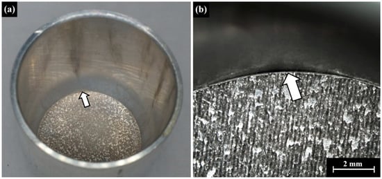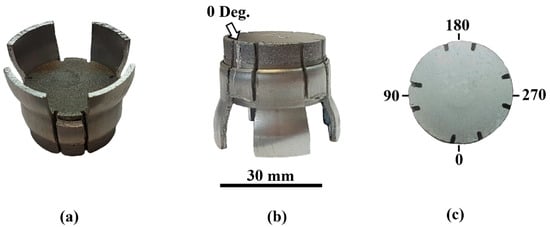 - Peel tests were performed to determine the quality and failure type of joints produced by diverse welding methods, such as resistance spot welding, etc.; ISO/AWI 23,598 standard [42] specifies the geometry of test specimens and the testing procedures for such a test. A manual peel test was used to assess the macro weld quality of the welded specimens at four positions around the circumference: 0°, 90°, 180°, and 270° (Figure 4). The isometric view of the specimen after a peel test is shown in Figure 4a,b. The position at the coil’s slot (0°) is of special interest during process parameter development, due to locally reduced magnetic field intensity in this specific region.