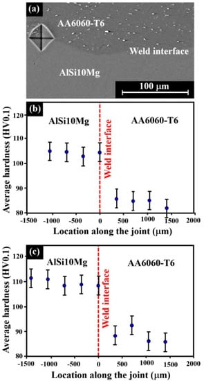 - Vickers microhardness (HV) indentation tests were performed with a Buehler MMT-7 tester (Bühler, Uzwil, Switzerland), using a 100 g load and 10 s. duration load, in order to estimate joint mechanical properties.