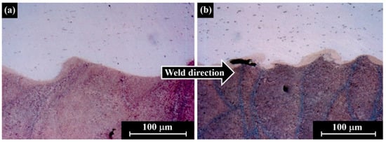 - Metallographic samples of the welded parts were prepared according to the ASTM-E3 standard. The surface preparation included sectioning, grinding, and fine polishing steps (up to 0.05 µm). The microstructure was etched with a modified Flick’s reagent (10% HF-90% H2O).