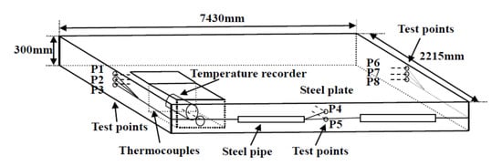 The locations of the temperature measurement points in the steel plate are illustrated in Figure 1. Temperature measurement points P1, P2, and P3 were located at the tail of steel plate, points P4 and P5 were located at the middle of steel plate, and points P6, P7, and P8 were located at the head of the steel plate. The three temperature measurement points located at the head (P6, P7, and P8) and tail (P1, P2, and P3) of the steel plate were arranged along the thickness direction at 3.5 mm, 75 mm (1/4-thickness), and 150 mm (1/2-thickness) below the surface of the steel plate. The two temperature measurement points located in the middle of the steel plate (P4 and P5) were arranged along the thickness direction at 75 mm (1/4-thickness) and 150 mm (1/2-thickness) below the surface of the steel plate. Consequently, there were 8 measurement points in total with a diameter of 5 mm and a depth of 100 ± 0.5 mm.